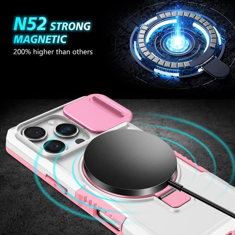 Funda híbrida TPU y PC con Soporte Magsafe y Protección deslizante para iPhone 16 Pro (Rosa y Blanco)
