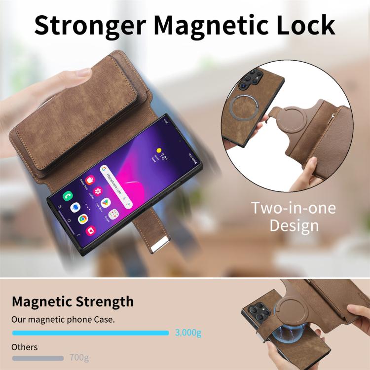 Funda Neo MagSafe RFID antirrobo con cremallera para Samsung Galaxy S24 Ultra 5G, estilo billetera de cuero retro (marrón)