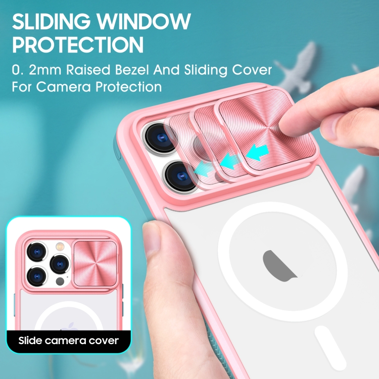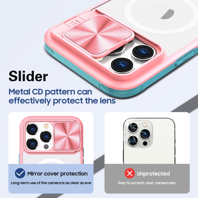 Funda para iPhone 12 Pro Max Cubierta Deslizante Acrílico Transparente PC TPU Magsafe (Rosa + Cian)