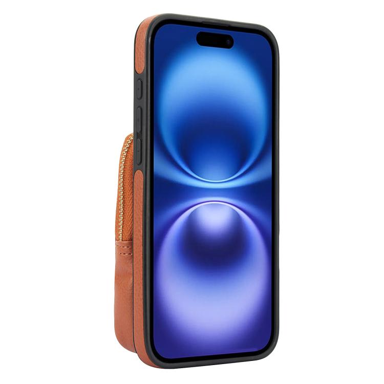 Funda para iPhone 16 Awquer con Cremallera Cruzada y Billetera de Cuero de Lichi (Marrón)