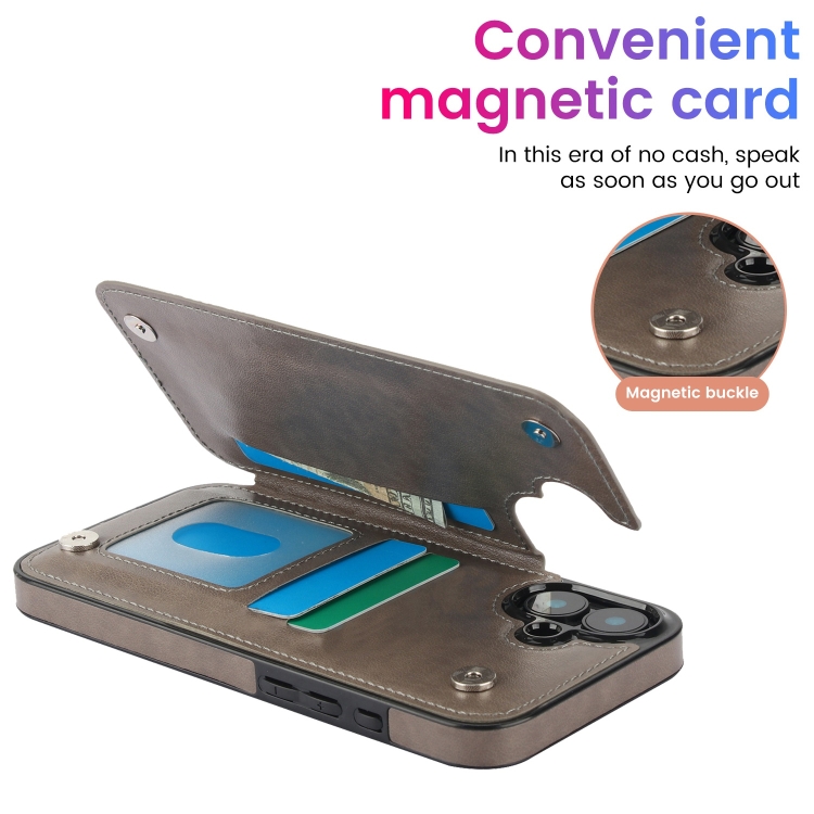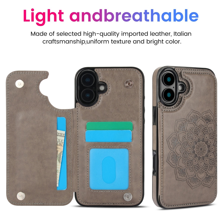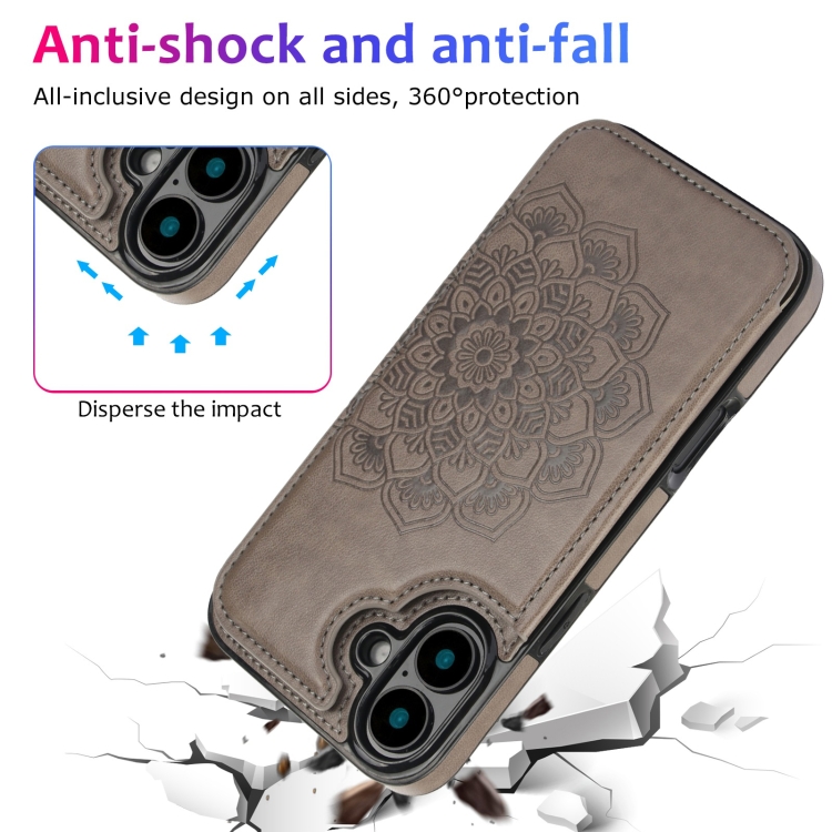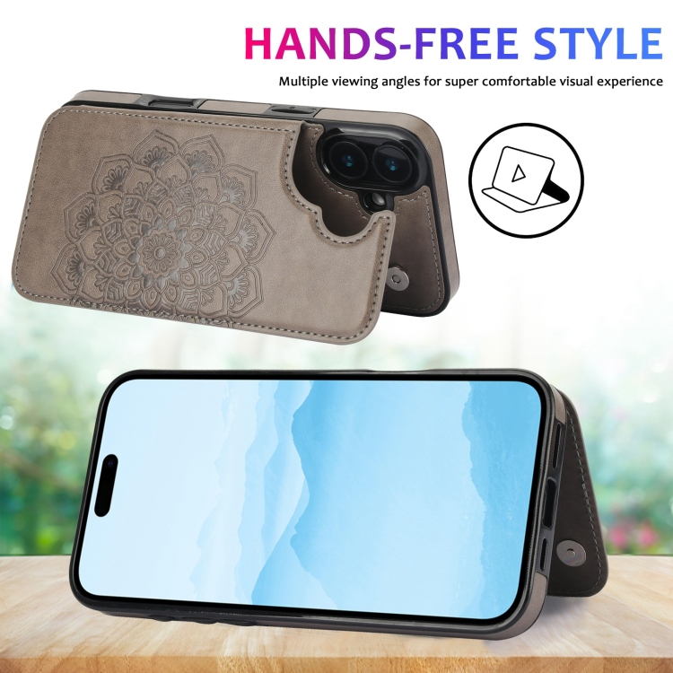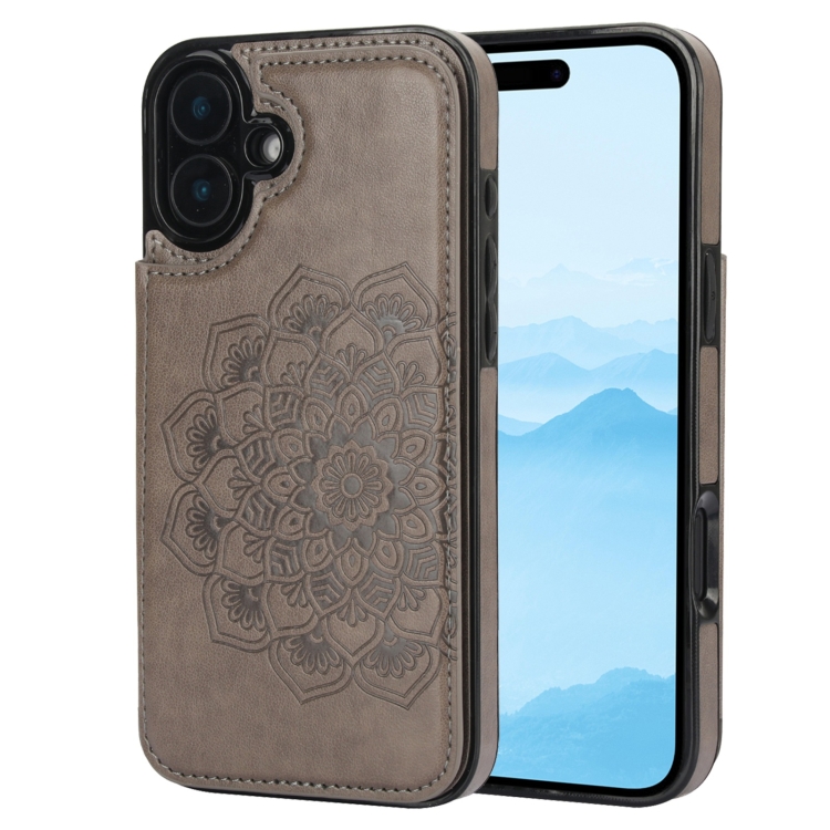 Funda para iPhone 16 Doble Hebilla Diseño Mandala Piel Tipo Billetera (Gris)