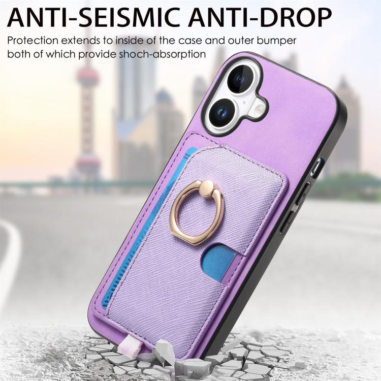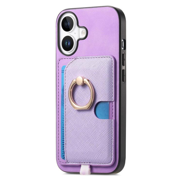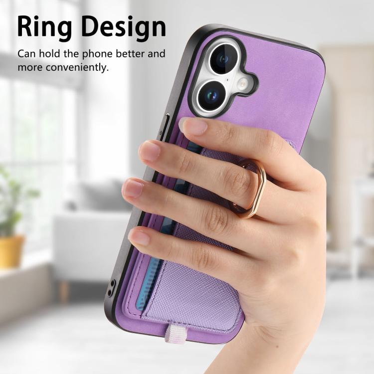 Funda para iPhone 16 con Ranuras para Tarjetas Diseño Retro Cruz Anillo Lateral (Morado)