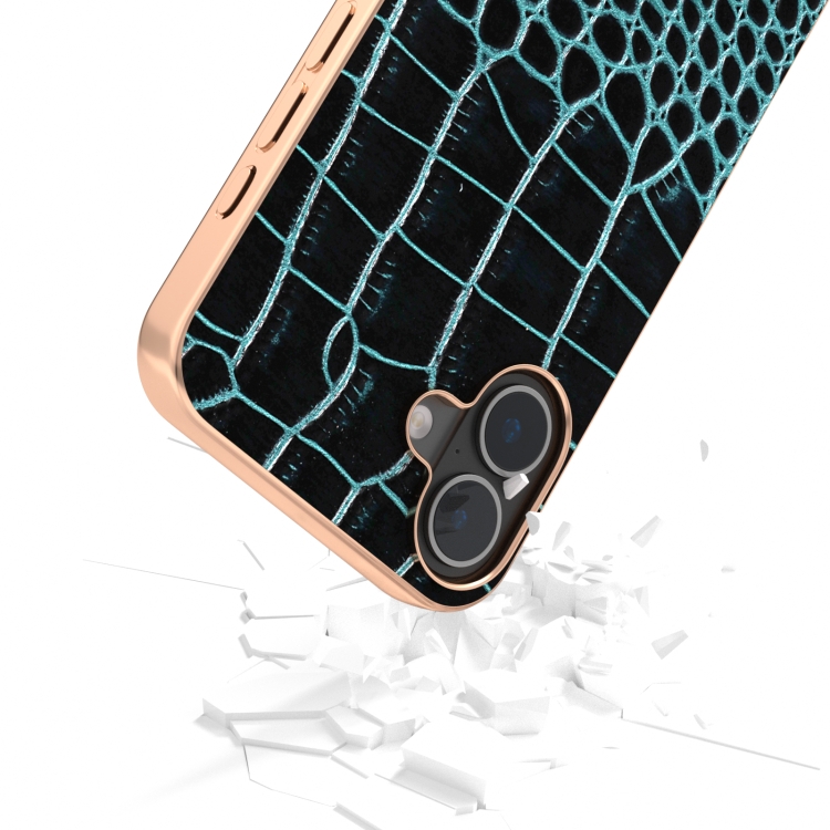 Funda para iPhone 16 Plus Abeel Diseño Cocodrilo Cuero Genuino Marco Galvanizado (Azul)