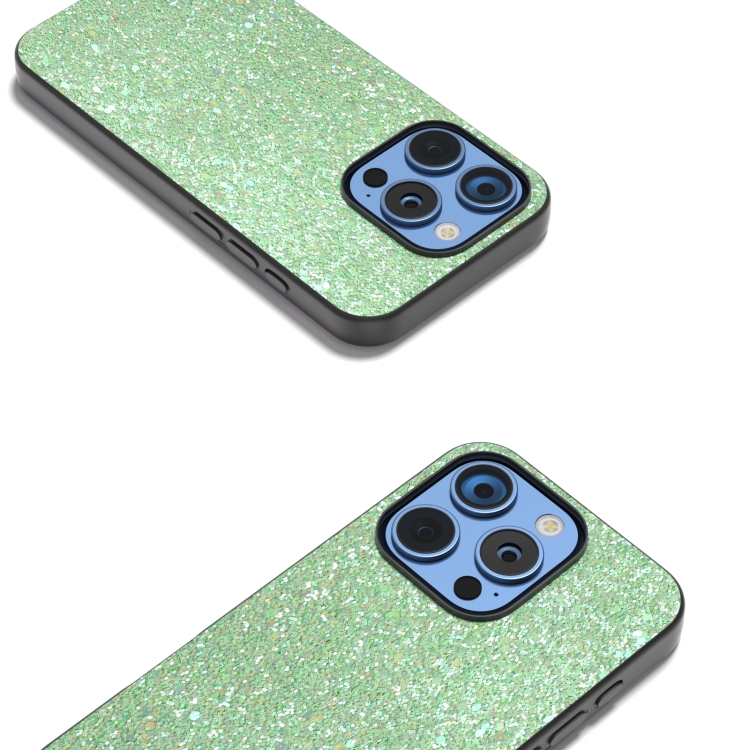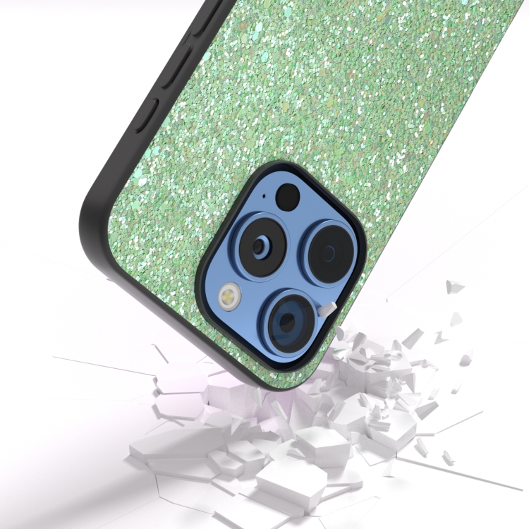 Funda para iPhone 16 Pro con Marco Negro y Purpurina de Colores (Verde Oscuro)