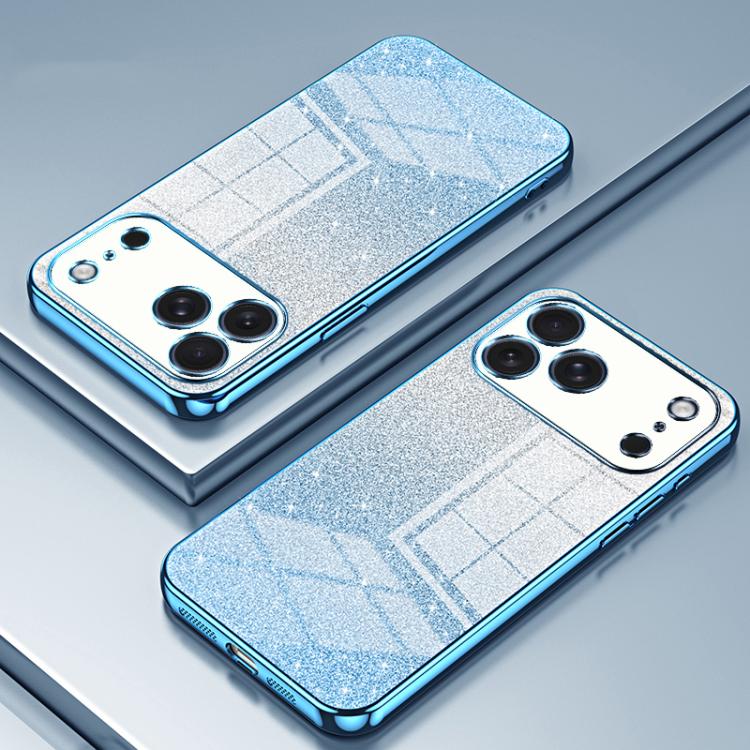 Funda para iPhone 17 Pro con purpurina en polvo degradado y galvanizada (azul)