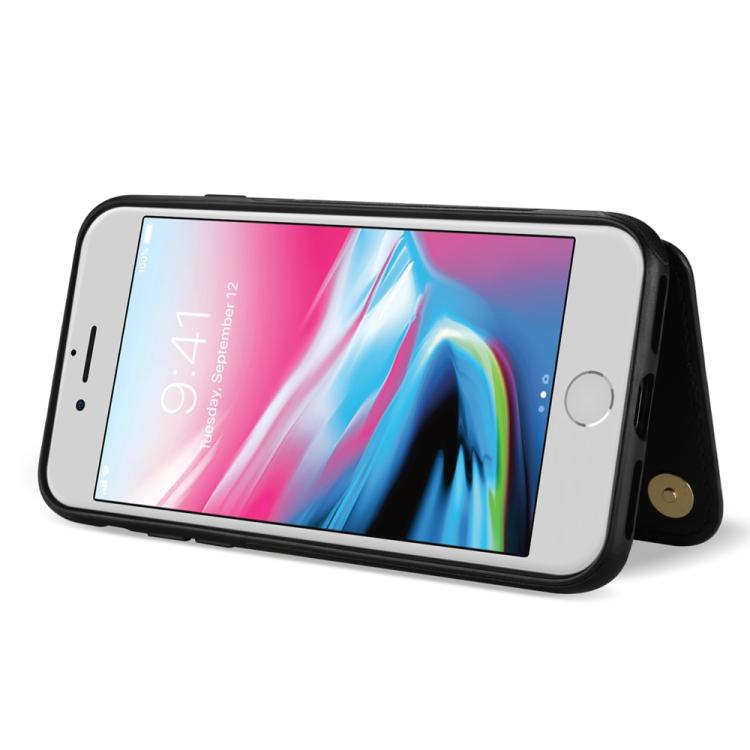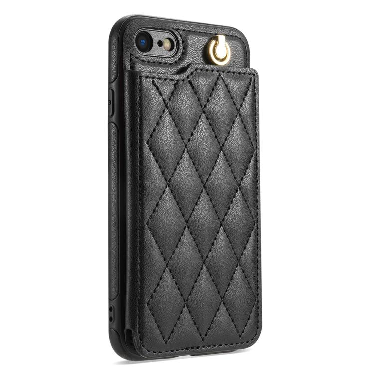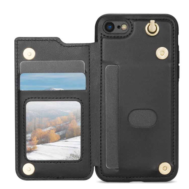 Funda para iPhone SE 2022/2020/8/7 con Ranuras para Tarjetas y Hebilla Doble Rombal y Cordón (Negro)