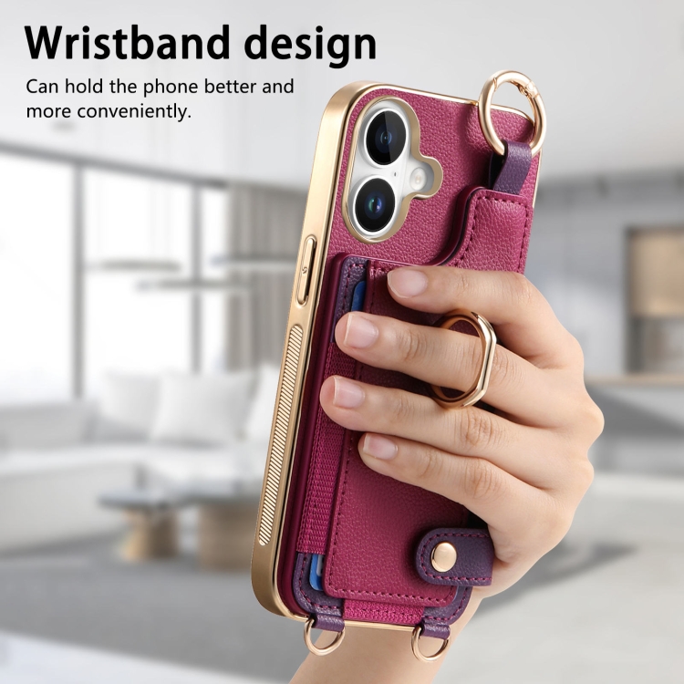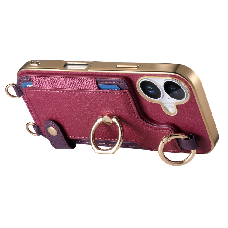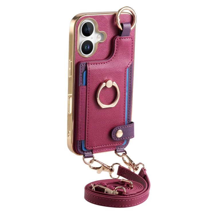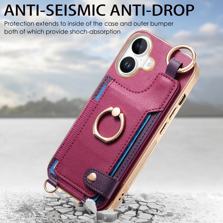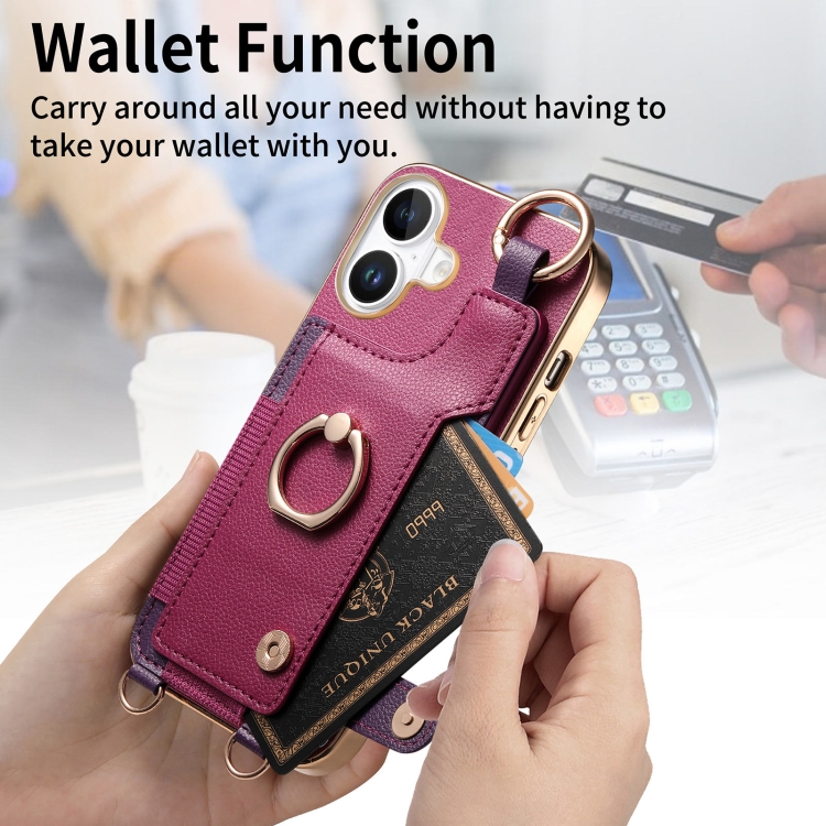 Funda para Teléfono iPhone 16 con Anillo y Tarjetero con Lazo para Colgar (Morado)