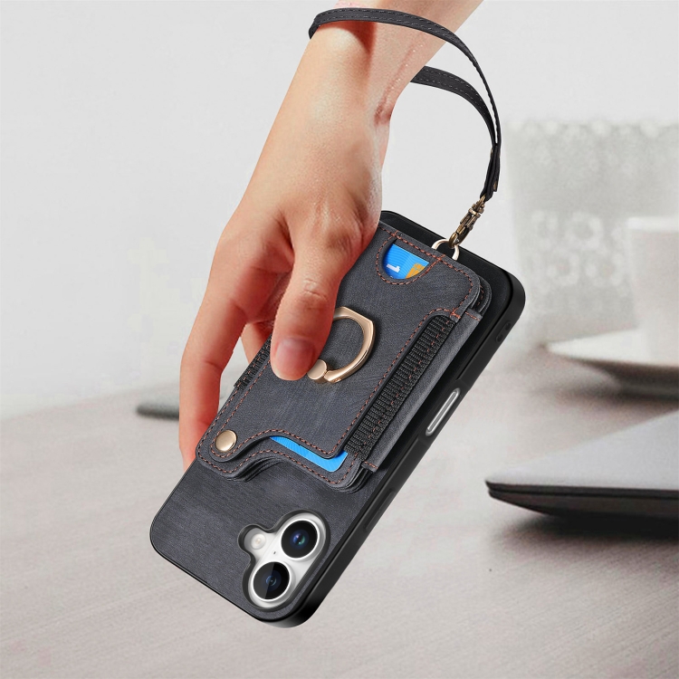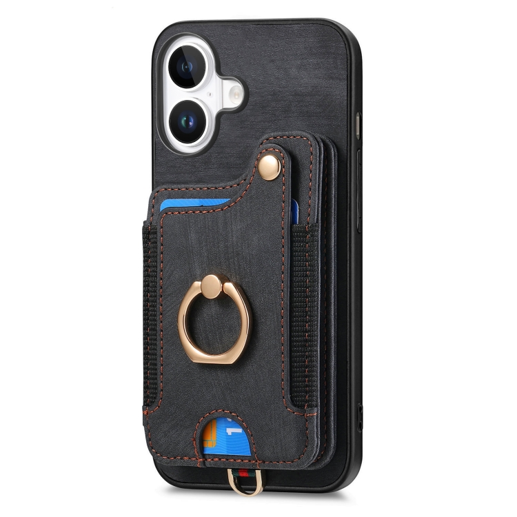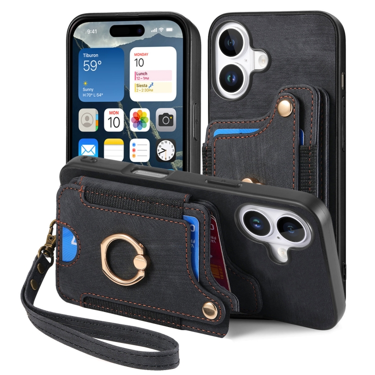 Funda para Teléfono iPhone 16 Plus Billetera MultiTarjeta Piel Sintética Anillo (Negra)