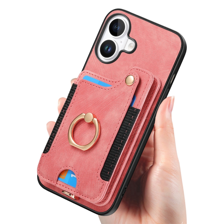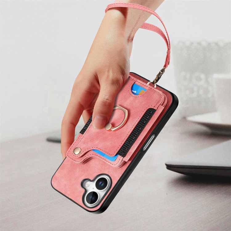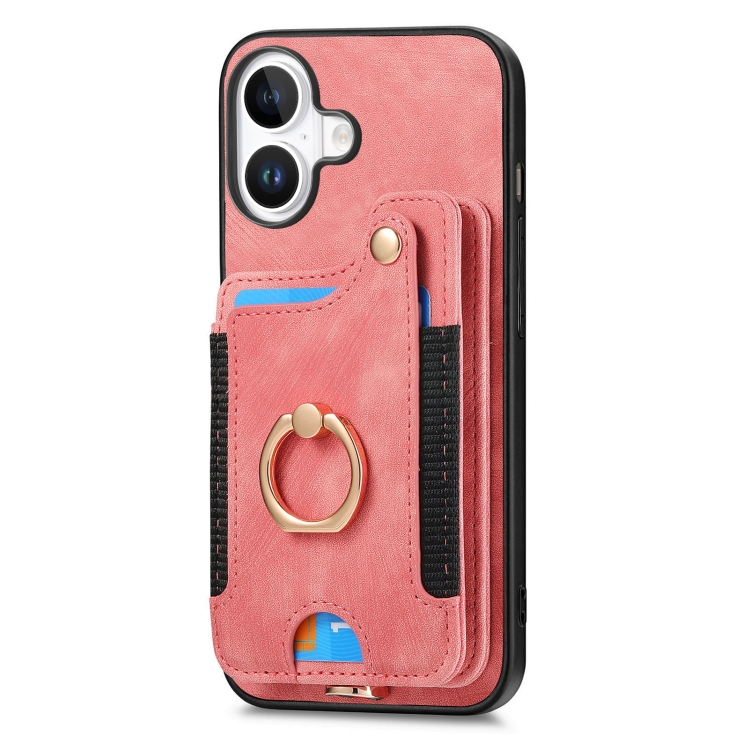 Funda para Teléfono iPhone 16 Plus Billetera MultiTarjeta Piel Sintética Anillo (Rosa)