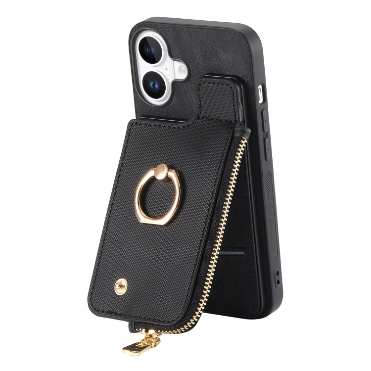 Funda para Teléfono Cuero iPhone 16 Plus Cremallera Vertical Anillo Cruzado (Negro)