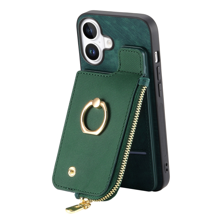 Funda para teléfono iPhone 16 Plus con cremallera vertical y anillo cruzado de cuero (Verde)