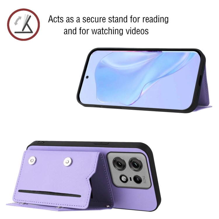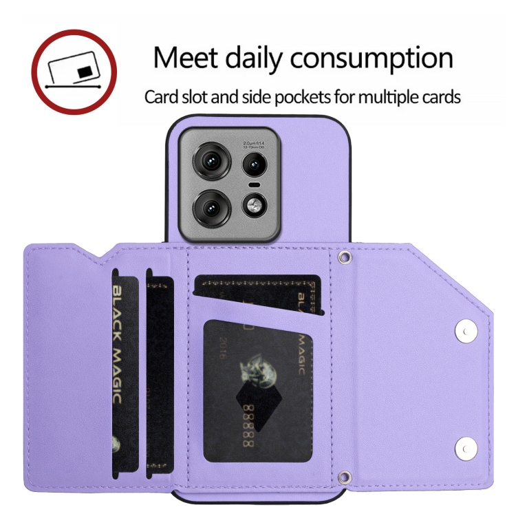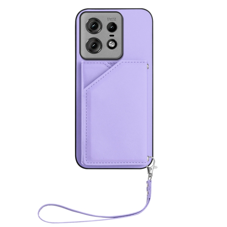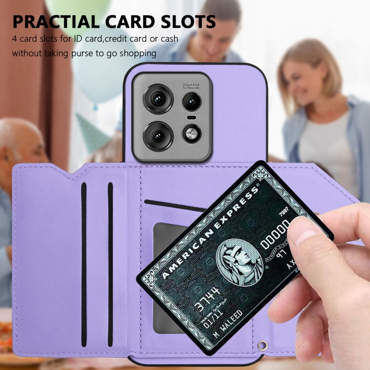Funda para Motorola Edge 50 Pro con 4 Ranuras para Tarjetas y Correa para Muñeca (Morado)