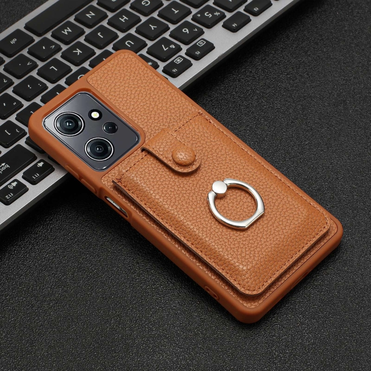 Funda para Teléfono con Diseño de Textura de Lichi y TaRJetero con Anillo para Redmi Note 12 4G (Marrón)
