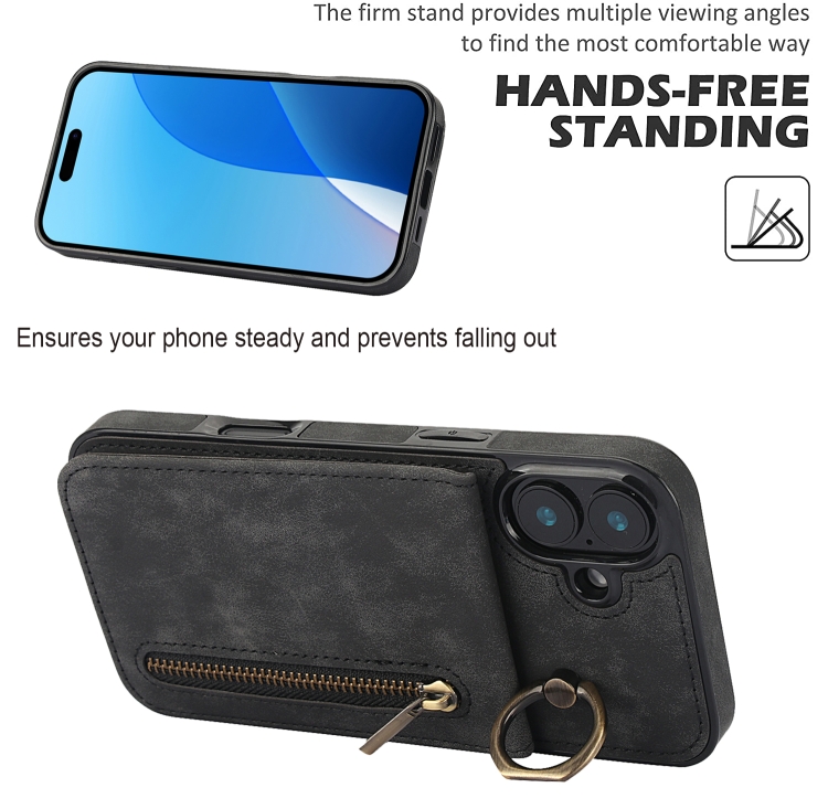 Funda para Teléfono iPhone 16 Ranura Tarjeta Rfid Anillo Retro Cremallera (Negra)