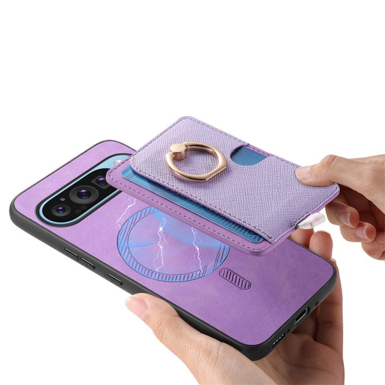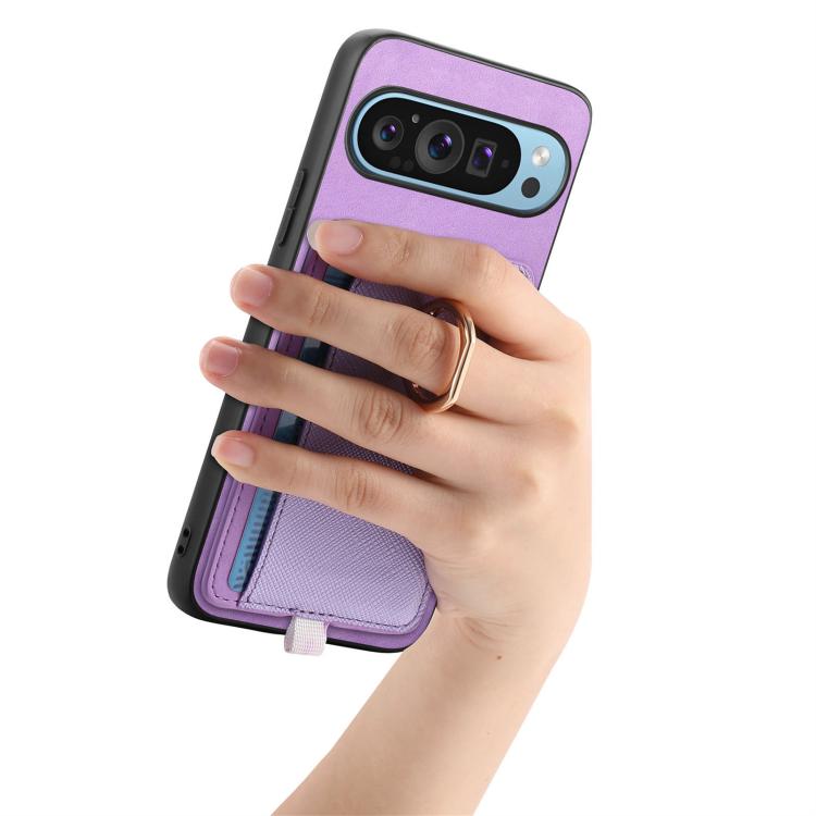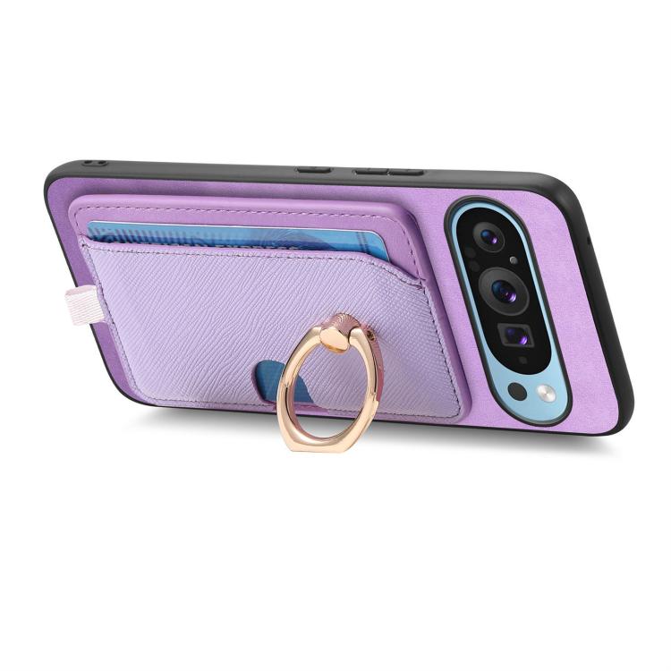 Funda para Teléfono Google Pixel 9/9 Pro con Ranuras para Tarjetas, Diseño Retro Cruz de Cuero y Anillo Lateral (Morado)