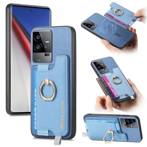 Funda para Teléfono con TaRJetero y Anillo de Cuero con Diseño Retro Magsafe Cross para Vivo Iqoo 11 Pro 5G (Azul)