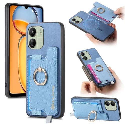 Funda para Teléfono con TaRJetero y Anillo de Cuero con Diseño Retro Magsafe para Redmi 13C / Poco C65 / M6 (Azul)