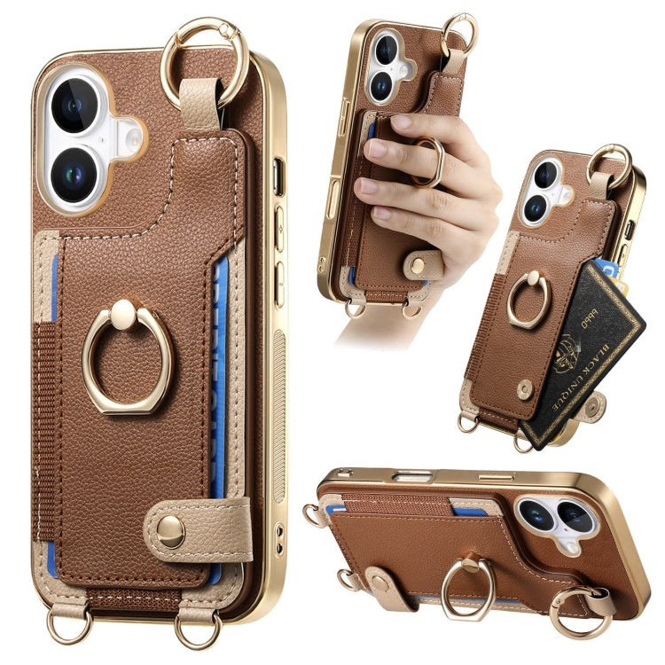 Funda para Teléfono iPhone 16 con Tarjetero, Anillo y Lazo para Colgar (Marrón)