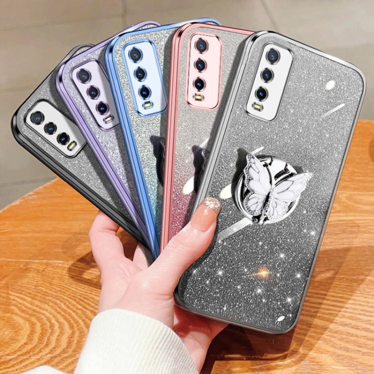 Funda para Teléfono de TPU con Soporte para Mariposas con Purpurina Degradada Plateada para Vivo Y30/Y20 (Morado)