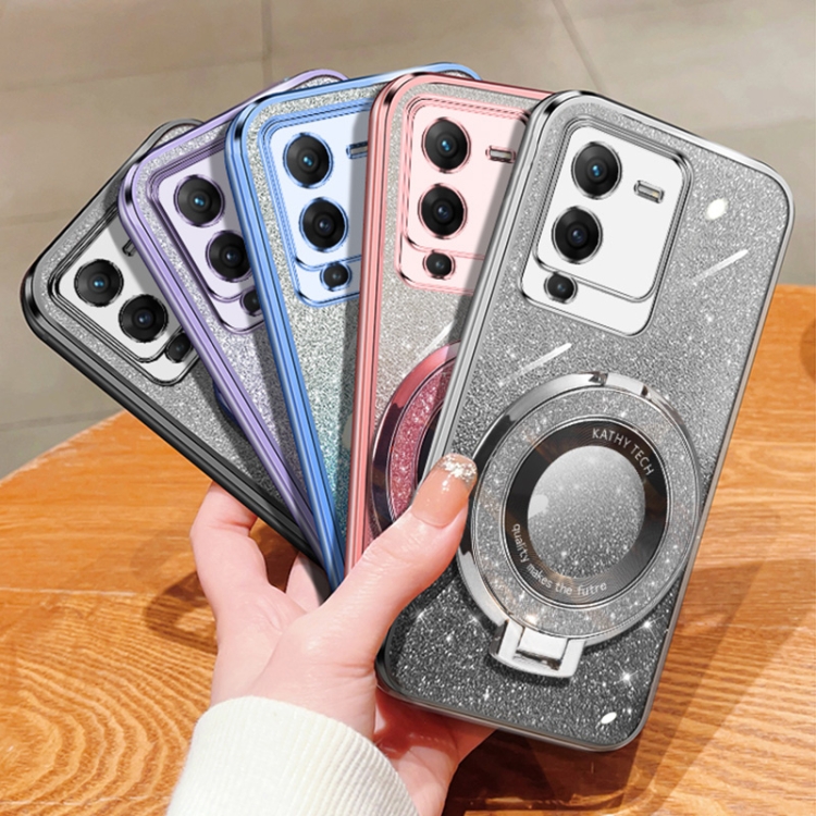 Funda para Teléfono de TPU con Soporte Redondo con Purpurina Degradada Plateada para Vivo S15 Pro (Azul Sierra)