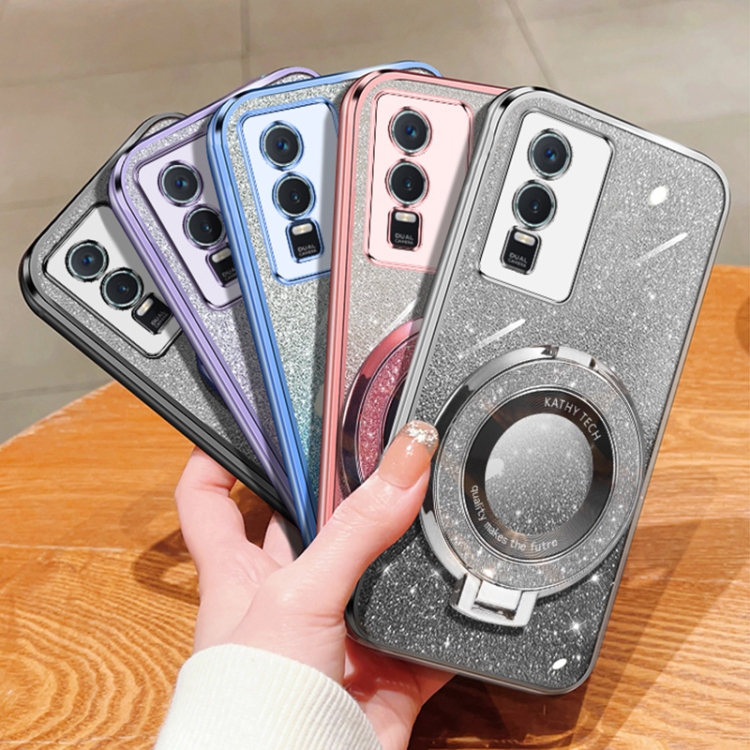 Funda para Teléfono de TPU con Soporte Redondo con Purpurina Degradada Plateada para Vivo Y76S (Plateada)