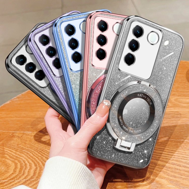 Funda para Teléfono de TPU con Soporte Redondo y Purpurina Degradada Plateada para Vivo S16E (Negro)