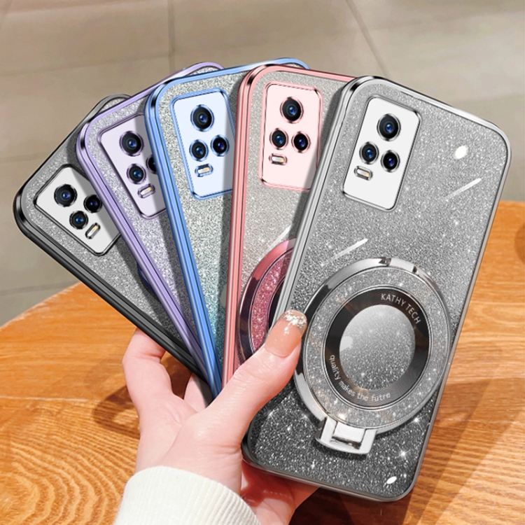 Funda para Teléfono de TPU con Soporte Redondo y Purpurina Degradada Plateada para Vivo V21E (Negro)