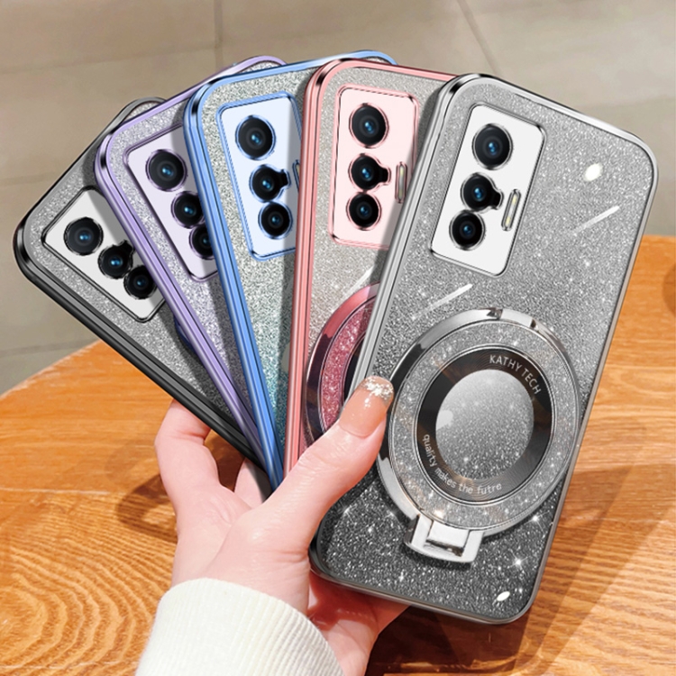 Funda para Teléfono de TPU con Soporte Redondo y Purpurina Degradada Plateada para Vivo X70 (Azul Sierra)