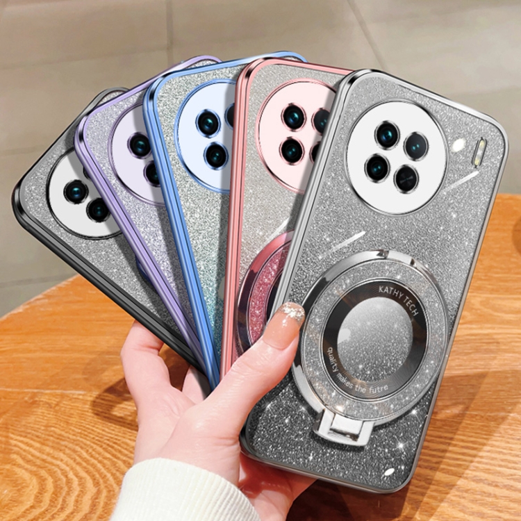 Funda para Teléfono de TPU con Soporte Redondo y Purpurina Degradada Plateada para Vivo X90 (Azul Sierra)
