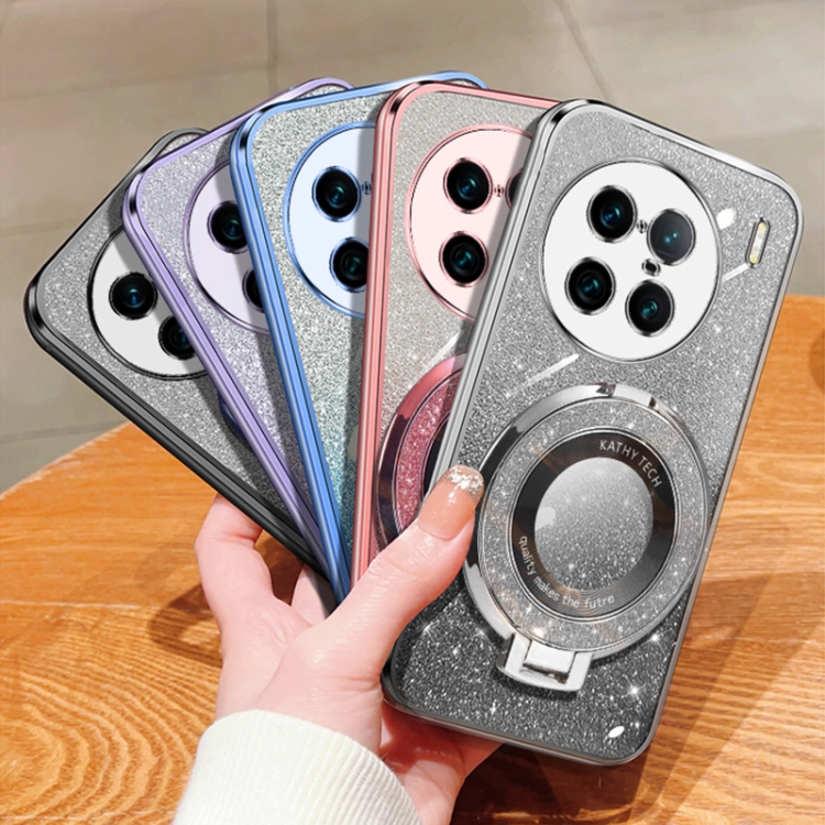 Funda para Teléfono de TPU con Soporte Redondo y Purpurina Degradada Plateada para Vivo X90 Pro+ (Azul Sierra)
