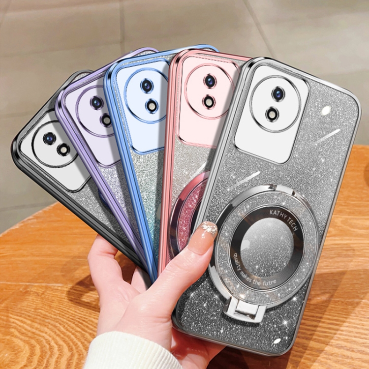 Funda para Teléfono de TPU con Soporte Redondo y Purpurina Degradada Plateada para Vivo Y02/Y11 2023 (Negra)