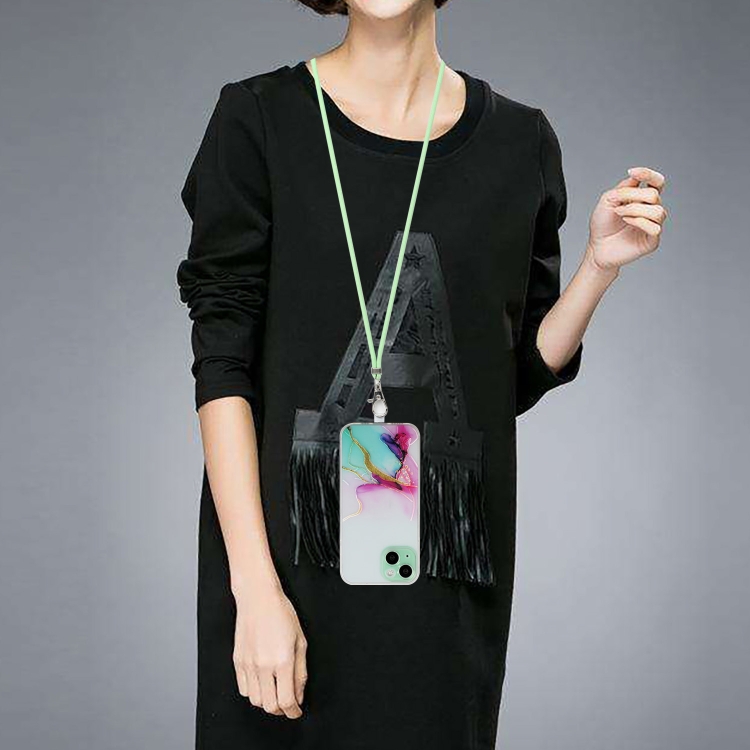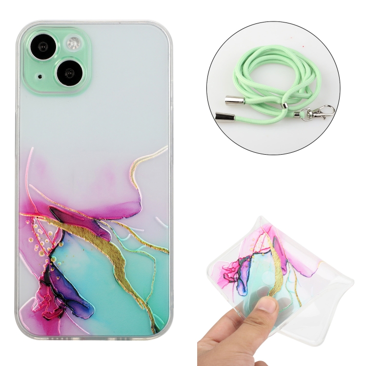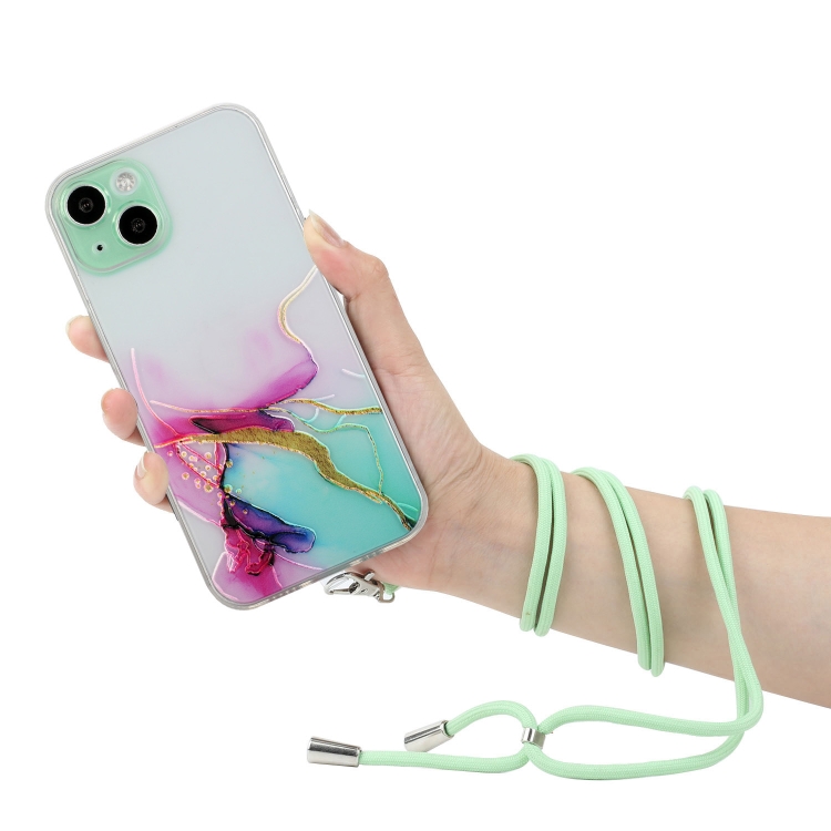 Funda Protectora TPU con Patrón de Mármol Hueco para iPhone 14 con Cuerda para Correa (Verde)