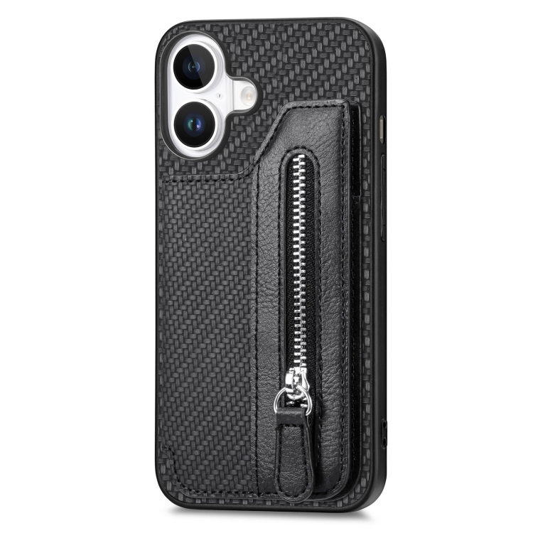 Funda Tipo Billetera con Cremallera y Tapa Horizontal de Fibra de Carbono para iPhone 16 Plus (Negra)