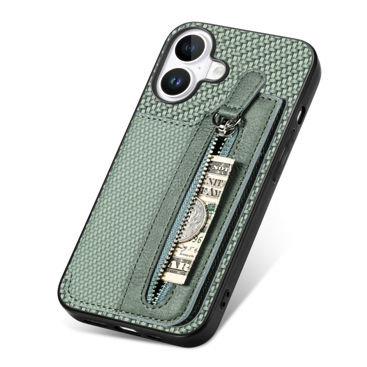 Funda Tipo Billetera con Cremallera y Tapa Horizontal de Fibra de Carbono para iPhone 16 Plus (Verde)