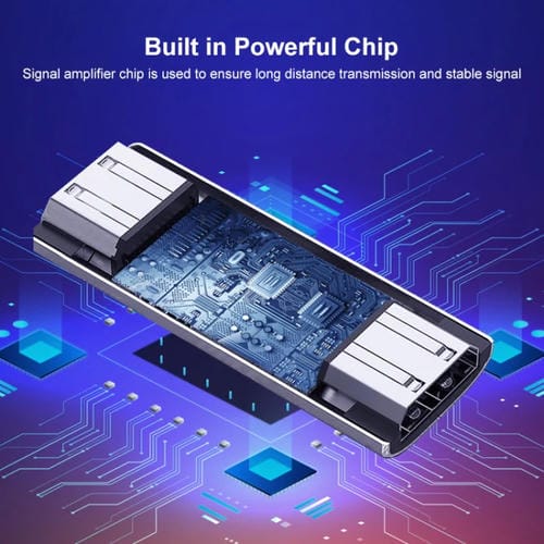 Este Adaptador amplifica la Señal para permitir extensiones de hasta 30 metros sin degradación significativa.