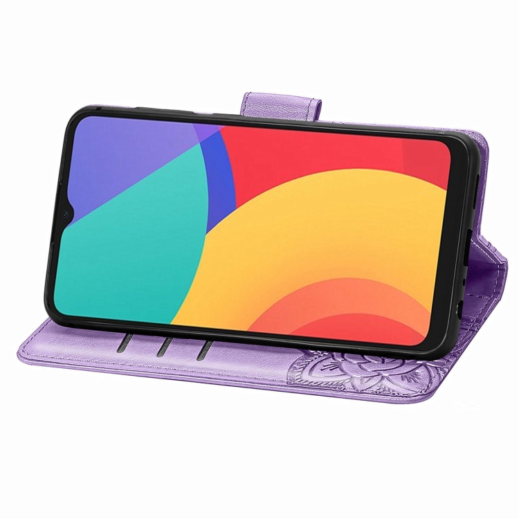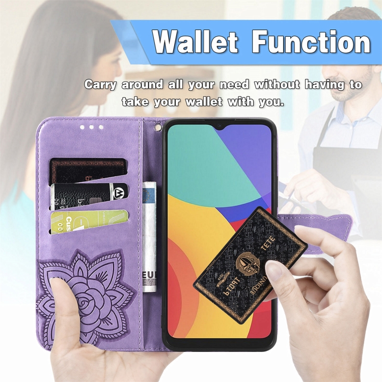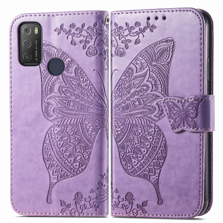 Funda De Cuero Horizontal Alcatel 1S 2021 Butterfly Love Con Soporte, Ranuras y Cordón (Púrpura Claro)