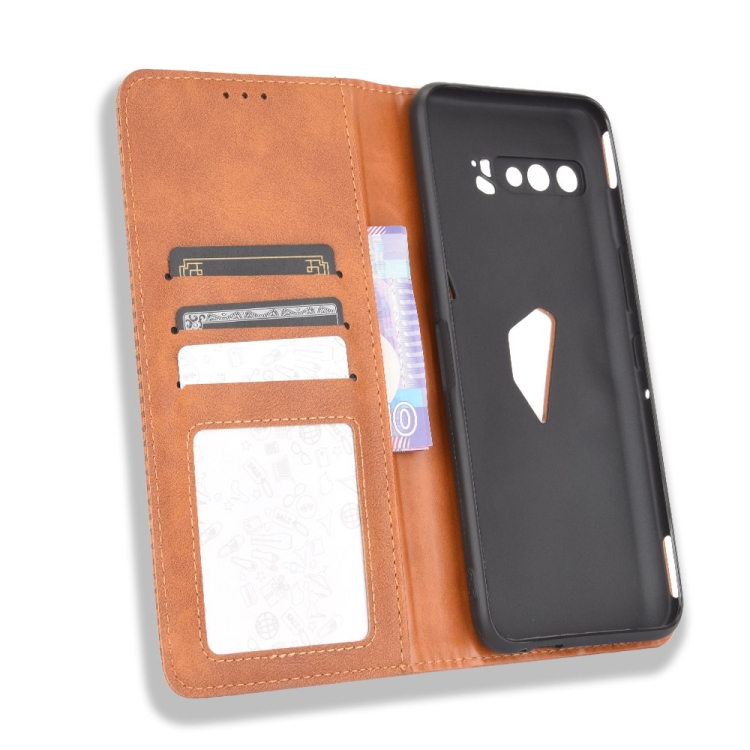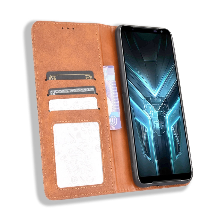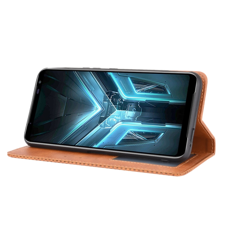 Funda de Cuero para Asus Rog Phone 3 Zs661Ks con Hebilla Magnética, Tapa Horizontal, Soporte y Ranuras para Tarjetas (Marrón)