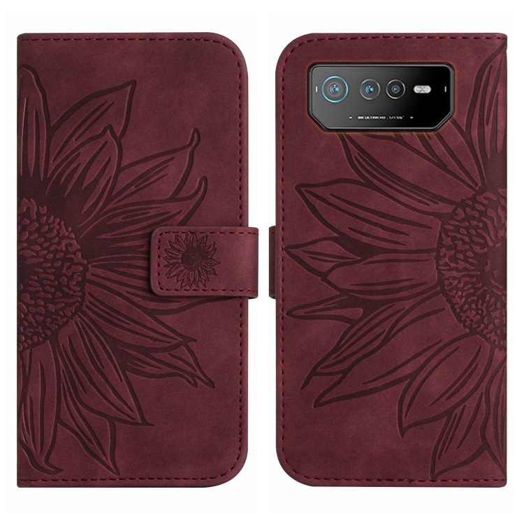 Funda de Cuero con Tapa y Cordón para Asus Rog Phone 6 Skin Feel Sun Flower (Rojo Vino)