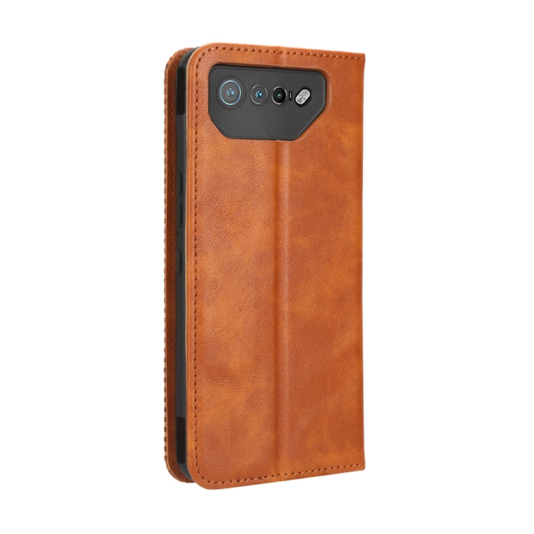 Funda de Cuero para Asus Rog Phone 7 con Hebilla Magnética y Textura Retro (Marrón)