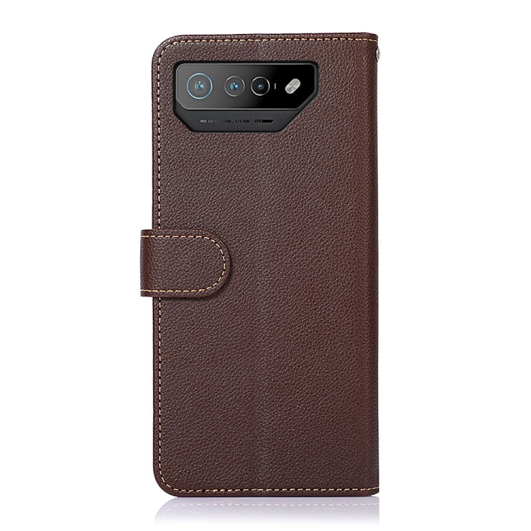 Funda para Asus Rog Phone 7 Khazneh con Textura Litchi de Cuero y Protección RFID (Marrón)
