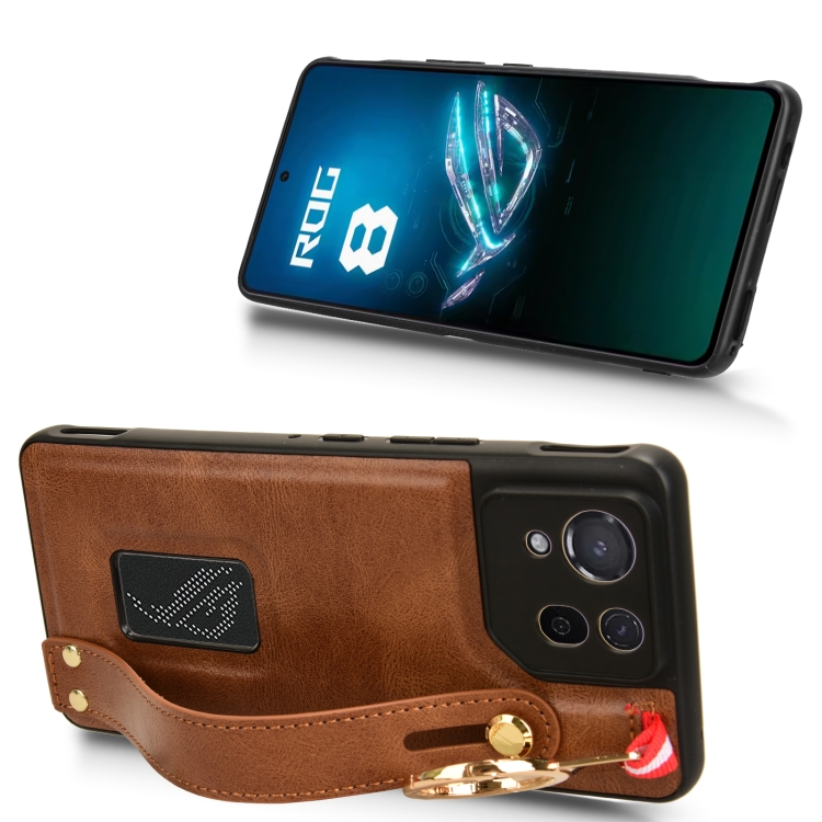 Funda Trasera de Cuero para Asus Rog Phone 8 Pro con Pulsera (Marrón)
