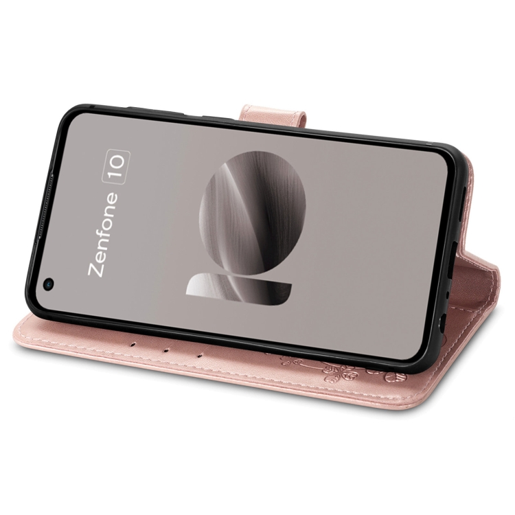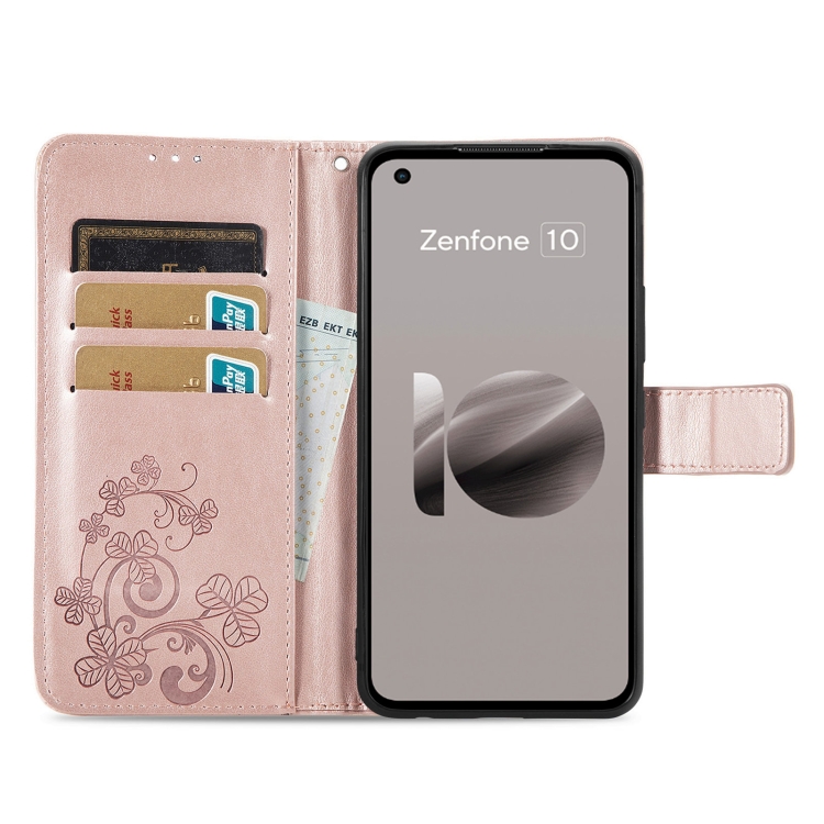 Funda de Cuero para Asus Zenfone 10 con Hebilla en Relieve y Cierre de Cuatro Hojas (Oro Rosa)