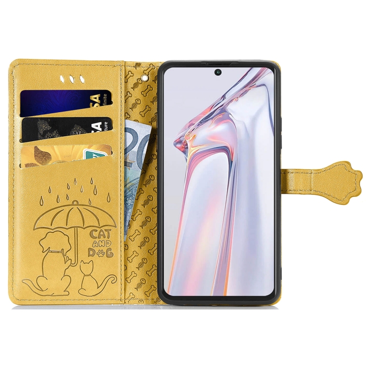 Funda Cuero Flip BlackView A100 Patrón Gato y Perro con Slots Tarjetas y Lanyard (Amarillo)