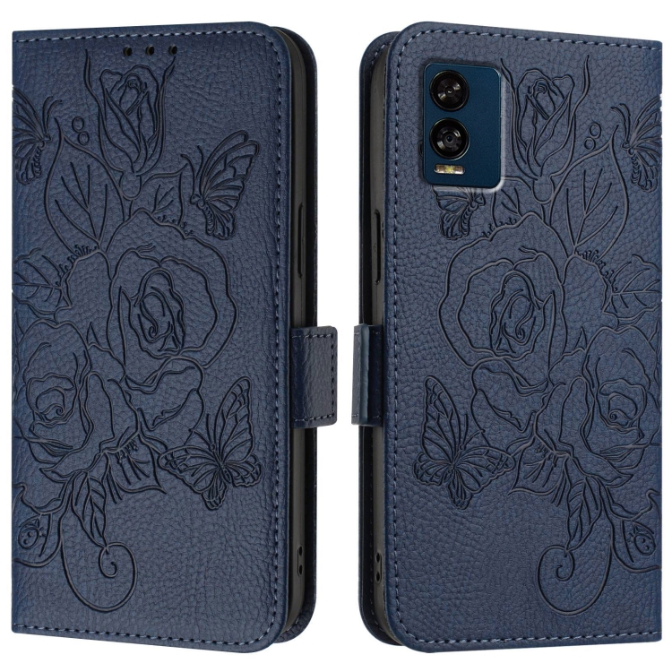 Funda para BLU View Speed 5G B1550Vl Cuero Antirrobo RFID con Rosa En Relieve (Azul Oscuro)