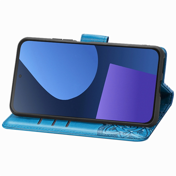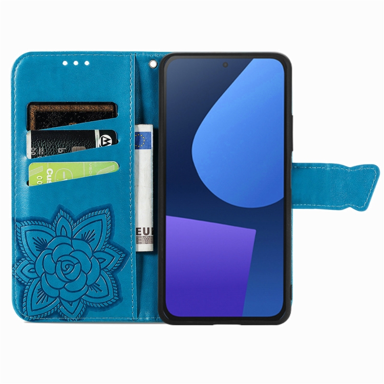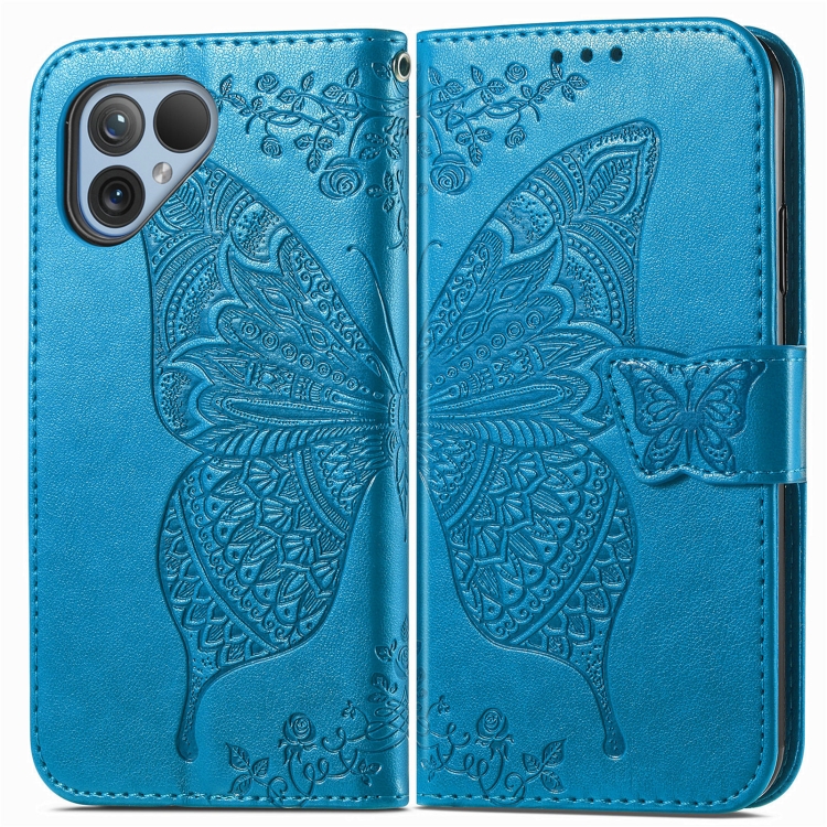 Funda de Cuero para Fairphone 5 con Relieve de Flor y Mariposa (Azul)