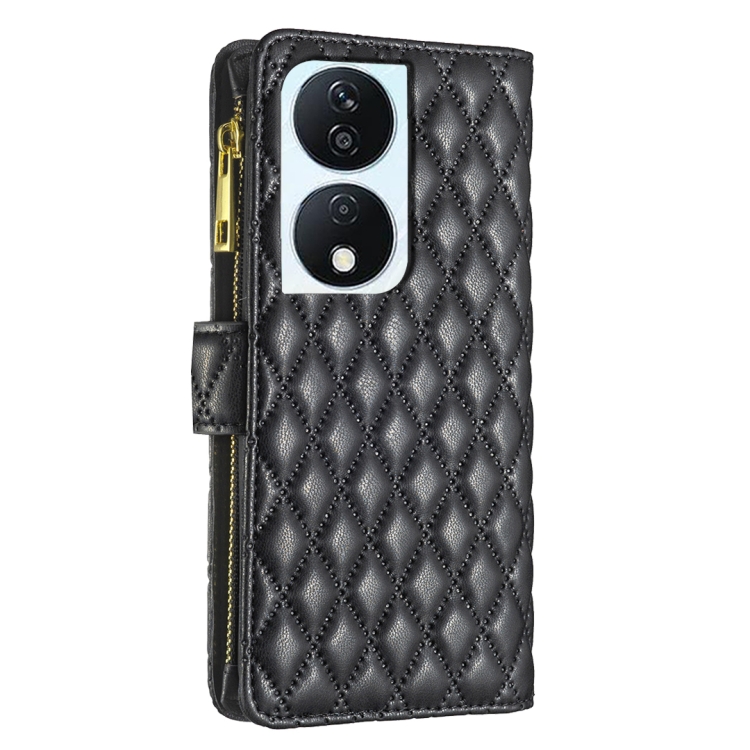 Funda de Cuero para Honor X7B Diamond Lattice con Zipper y Tapa (Negro)