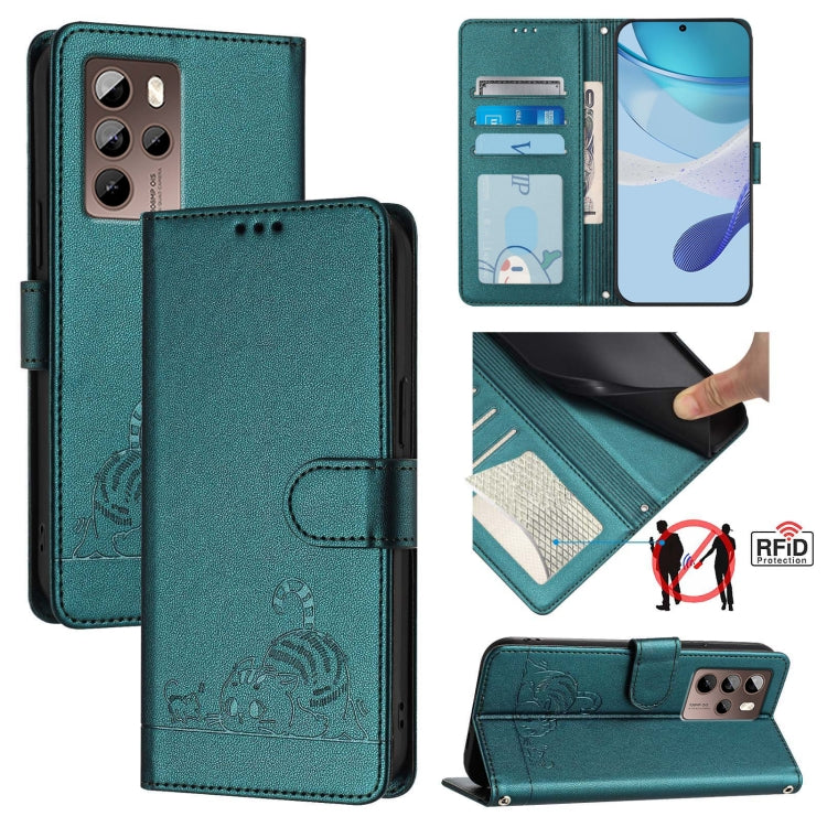 Funda para HTC U24 Pro CAT Rat de Cuero RFID con Patrón en Relieve y Cordón (Verde Pavo Real)