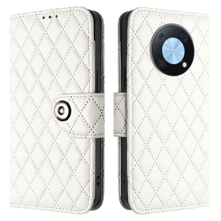 Funda para Huawei Enjoy 50 Pro y Nova Y90 con Tapa de Cuero Textura Rómbica y Cordón (Blanco)