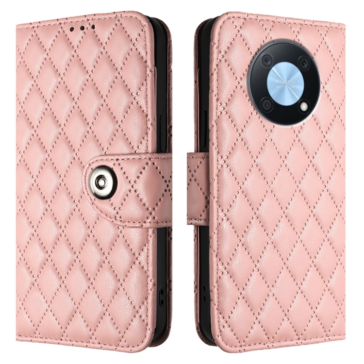- 1x Funda para Huawei Enjoy 50 Pro y Nova Y90 con Tapa de Cuero, textura rómbica y cordón (Rosa Coral)