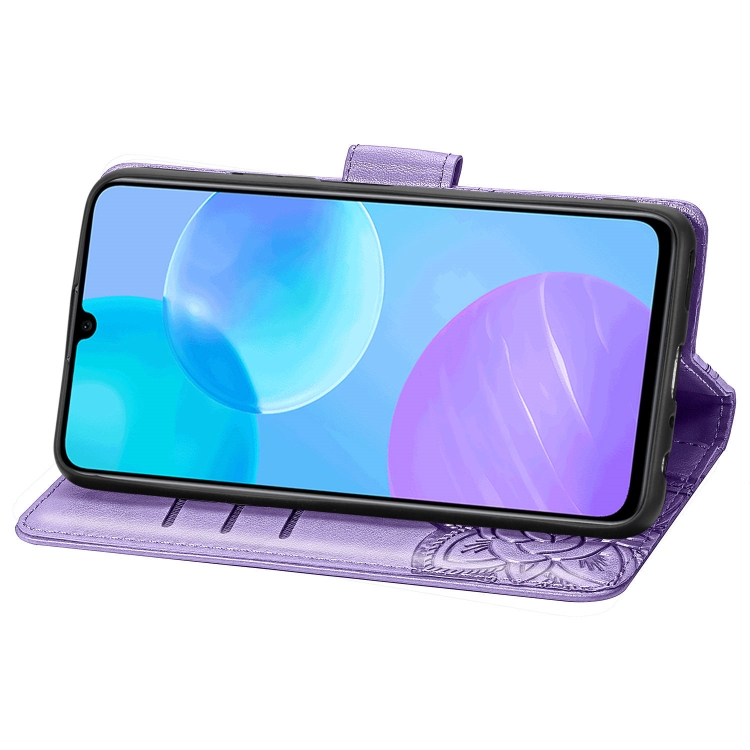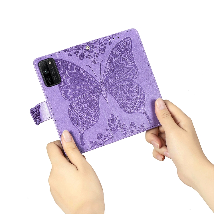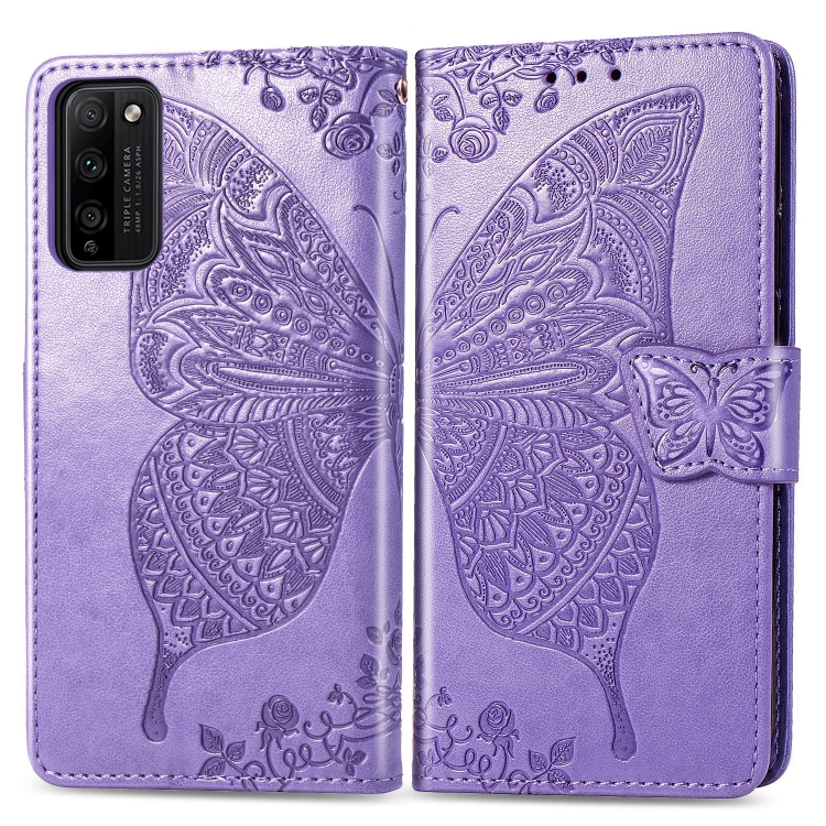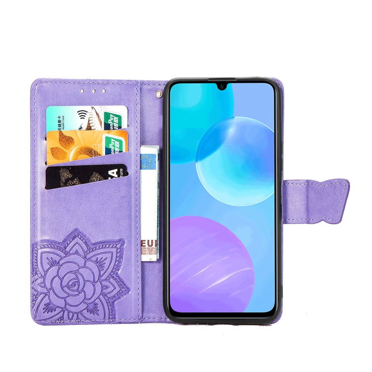 Para Huawei Honor 30 Lite Butterfly Love Flower Funda de cuero con tapa horizontal en relieve con soporte, ranuras para tarjetas, billetera y cordón (morado claro)